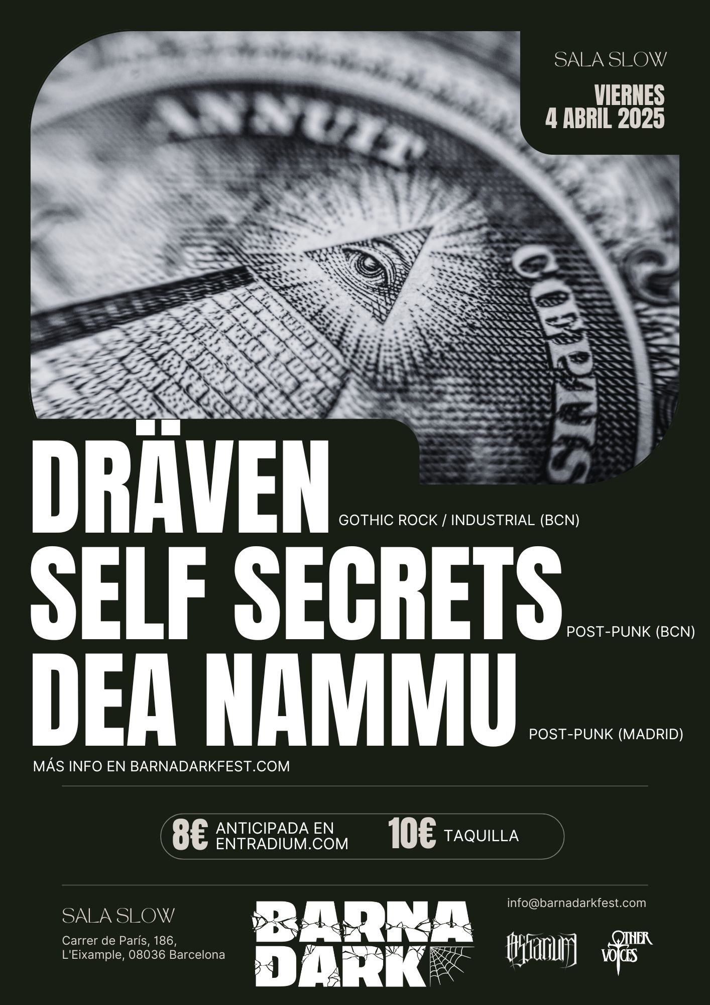 Barnadark vuelve a la Sala Slow, acompañados de tres propuestas imprescindibles: Self Secrets, con su mezcla de post-punk y cold wave; Dräven, trayendo su potente rock gótico con toques industriales; y los madrileños Dea Nammu, con su singular estilo inspirado en temas de ciencia ficción. ¡Una cita obligada para amantes del género!