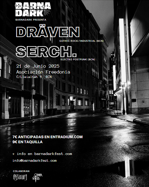 El próximo 21 de Junio, os traemos estas dos bandas para calentar motores previo al Barnadarkfest 2025. La Asociación Freedonia será el escenario para disfrutar nuevamente de Dräven con su característico Gothic/Industrial Rock. Por su parte, Serch. llenará el espacio con su mezcla de post-punk y música electrónica. ¡Una noche imprescindible en el corazón de Barcelona!
